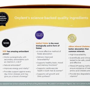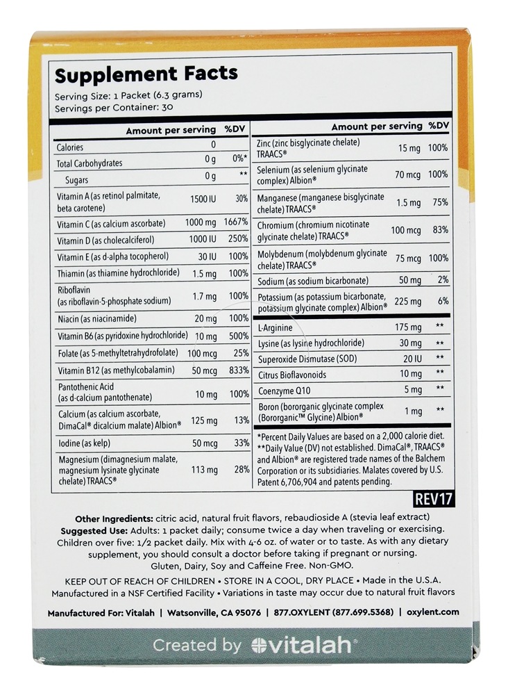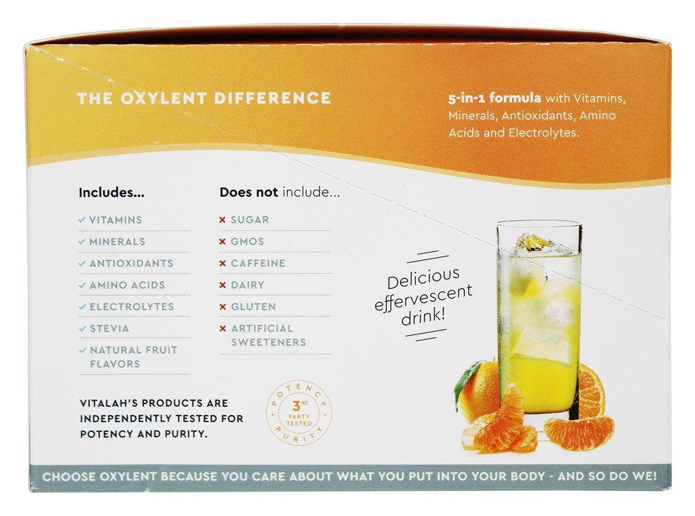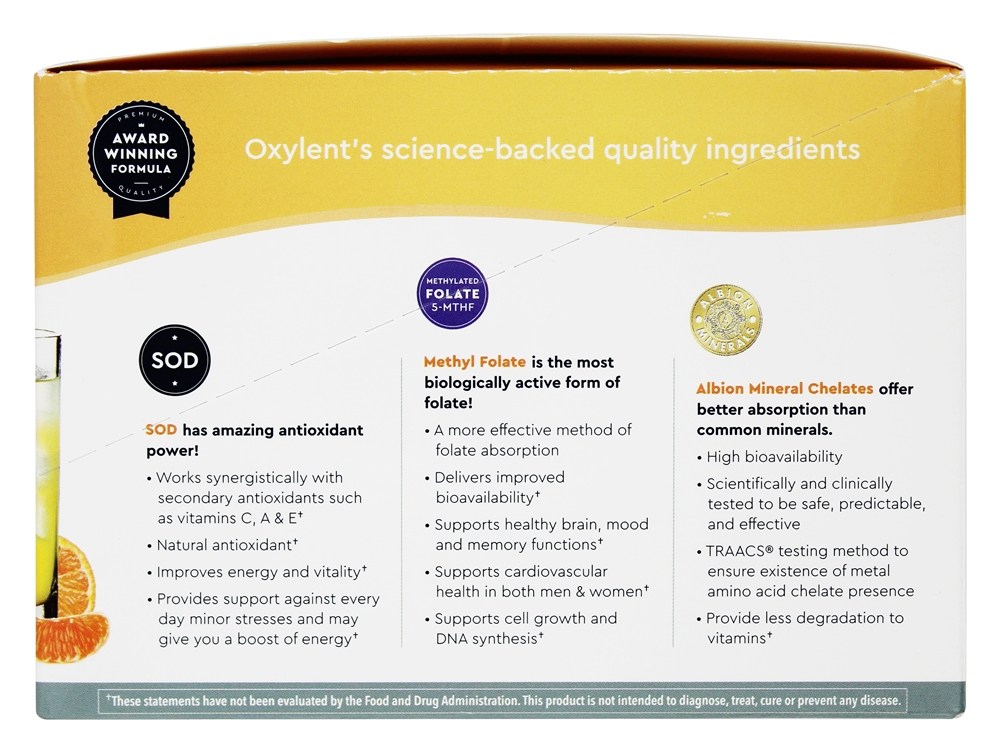 Oxylent é um multivitamínico diário premiado, 5 em 1 – tudo em uma bebida refrescante. Em vez de engolir comprimidos ou tabletes, adicione um pacote de Oxylent à água e desfrute de uma bebida espumante que fornece vitaminas, minerais, eletrólitos, aminoácidos e antioxidantes com fácil absorção. A fórmula exclusiva inclui 1000 mg vitamina C, 1000 IU vitamina D3, 100 % RDI ou mais de várias vitaminas B, os aminoácidos L-Arginina e Lisina, um painel completo de minerais Albion de qualidade superior, incluindo zinco, selênio, iodo, cálcio e magnésio, e o ingrediente único SOD (ou superóxido dismutase), que é uma poderosa enzima antioxidante que elimina bilhões de radicais livres.
