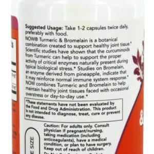 NOW Turmeric & Bromelain é uma combinação botânica criada para apoiar tecidos articulares saudáveis. Estudos científicos mostraram que os curcuminóides da cúrcuma podem ajudar a apoiar a atividade adequada de enzimas críticas naturalmente presentes durante o estresse biológico típico. Estudos sobre a bromelina, uma enzima derivada do abacaxi, indicam que ela pode reforçar a resposta normal do sistema imunológico. O NOW combina açafrão e bromelina para ajudar a manter os tecidos saudáveis das articulações diante de sobrecarga ocasional ou uso diário. Variação de cor natural pode ocorrer neste produto.