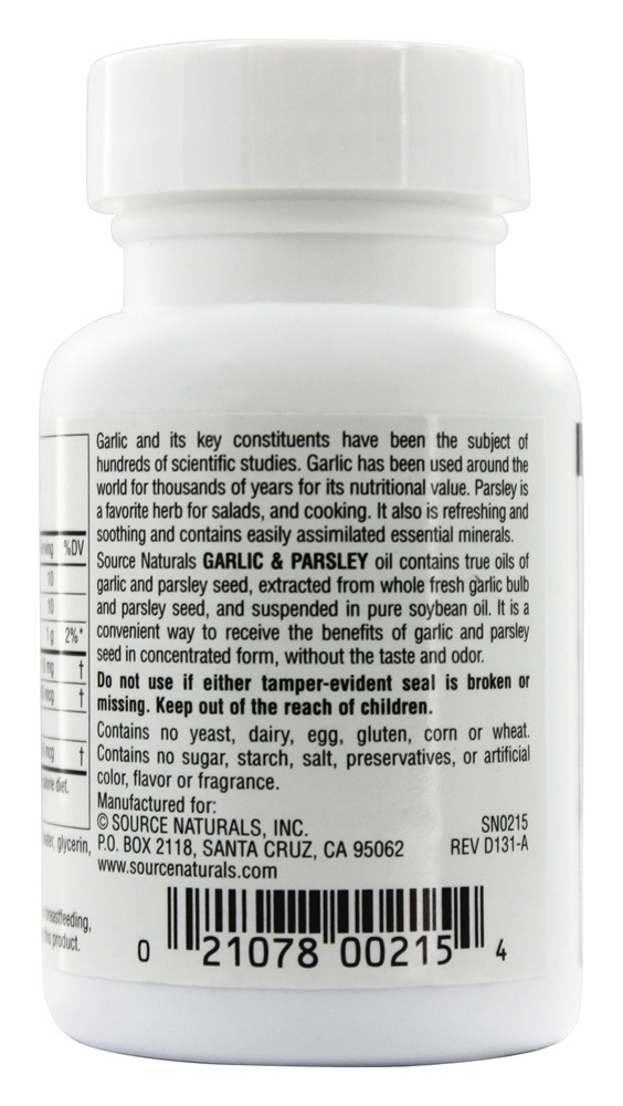 Source Naturals alho e a salsa são insípidos e inodoros. O alho e seus principais componentes têm sido objeto de centenas de estudos científicos. O alho tem sido usado em todo o mundo há milhares de anos pelo seu valor nutricional. A salsa é uma erva favorita para saladas e culinária. Também é refrescante e suavizante e contém minerais essenciais facilmente assimiláveis. Source Naturals O óleo de alho e salsa contém óleos verdadeiros de alho e salsinha, extraídos de bulbos inteiros de alho fresco e sementes de salsa e suspensos em óleo de soja puro. É uma maneira conveniente de receber os benefícios do alho e da semente de salsa na forma concentrada, sem o sabor e o odor.