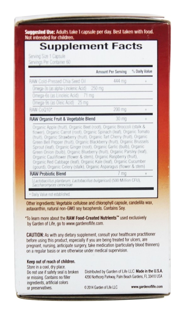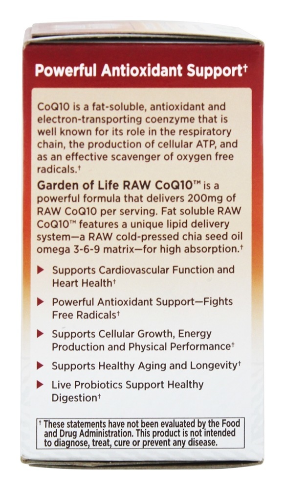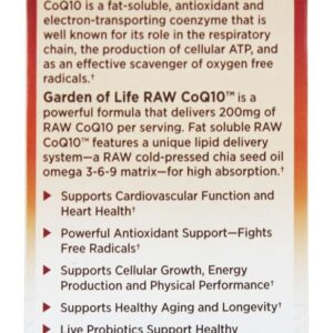 Garden of Life Raw CoQ10 200mg Raw CoQ10 Óleo de semente de Chia cru, Omega 3 – 6 – 9 Sistema de entrega de lipídios. Garden of Life está empenhada em oferecer a você a mais alta qualidade e nutrição integral para capacitá-lo a experimentar uma saúde extraordinária. RAW CoQ10 é um produto que exemplifica dois dos fundamentos mais fundamentais e fundamentais da Garden of Life da sobre a saúde humana. Garden of Life apresenta o RAW CoQ10 – uma fórmula poderosa que fornece 200 mg de Raw CoQ10 por veiculação. Com um sistema exclusivo de entrega de tampas – uma matriz ômega 3 – 6 – 9 óleo de semente de chia prensado a frio – e 22 Frutas e vegetais crus e cultivados organicamente – CoQ10 de gordura solúvel Raw suporta saúde do sistema cardiovascular, produção de energia celular e proteção antioxidante.