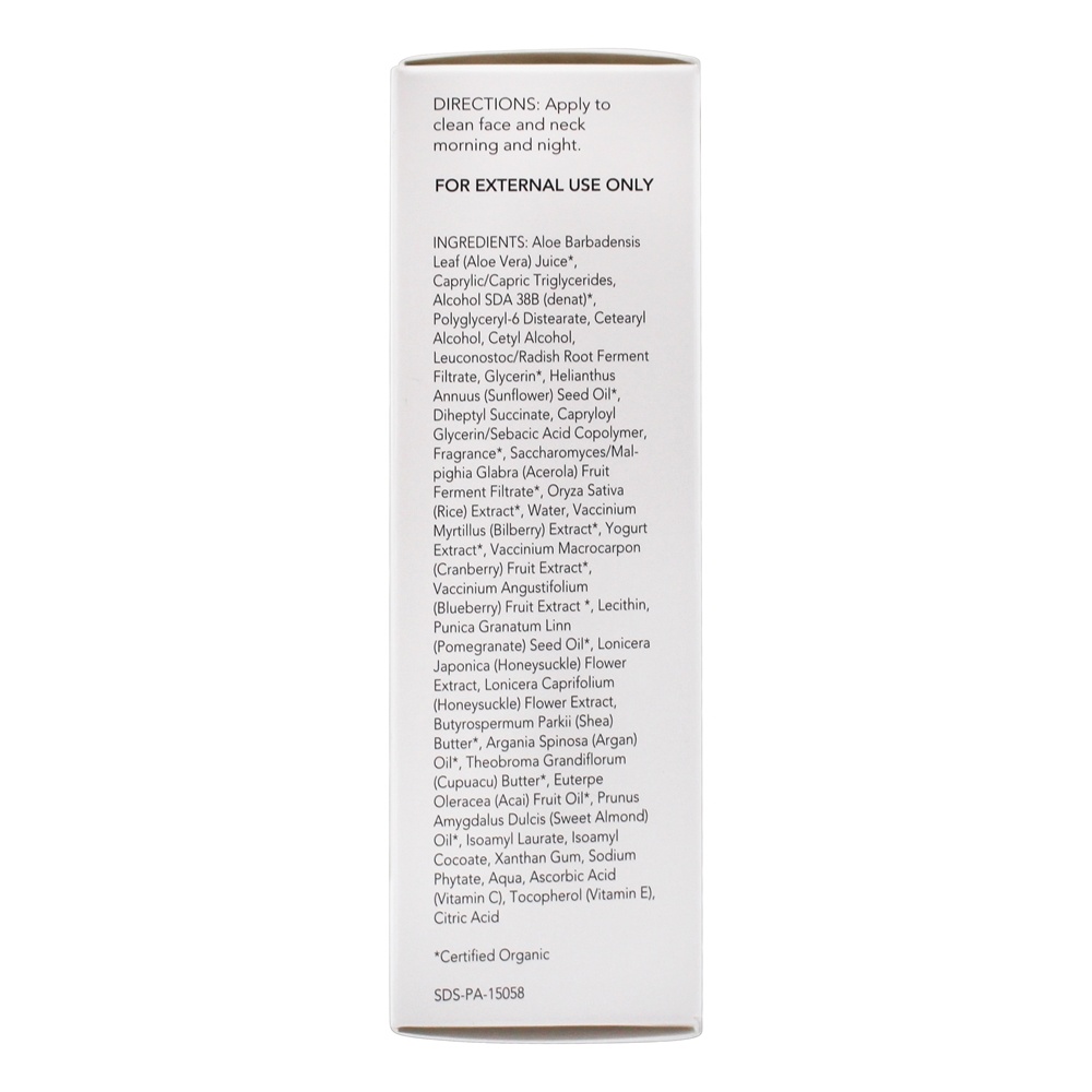 Suco de Aloe Barbadensis Leaf (Aloe Vera) *, Triglicerídeos Caprílico / Capric, Álcool SDA 38B (denat) *, Poliglicérila-6 Distearato, Álcool Cetearyl, Álcool Cetílico, Leuconostoc / Radish Raiz Ferment Filtrado, Glicerina *, Helianthus Annuus (Girassol) Semente Óleo *, Succinato de Diheptilo, Copolímero de Glicerina de Capriloílo / Ácido Sebácido, Fragrância *, Extrato de Oryza Sativa (Arroz), Extrato de Oryza Sativa (Arroz), Água, Vaccinium Myrtillus (Boldo) Extrato *, Extrato de Iogurte *, Extrato de fruta Vaccinium Macrocarpon *, Extrato de fruta Vaccinium Angustifolium *, Lecitina, Punica Granatum Linn (Romã) Óleo de semente *, Lonicera Japonica (Honeysuckle) Extrato de flor, Lonicera Caprifolium (Honeysuckle) Extrato de flor, Butyrospermum Parkii (Shea ) Manteiga *, Óleo de Argania Spinosa (Argan) *, Manteiga Theobroma Grandiflorum (Cupuacu) *, Óleo de Fruta Euterpe Oleracea (Açaí) *, Óleo Prunus Amygdalus Dulcis (Amêndoa Doce) *, Laurato Isoamil, Cocoato de Isoamil, Goma Xantana, Fitato de Sódio , Aqua, Ácido Ascórbico (Vitamina C), Tocoferol (Vitamina E), Ácido Cítrico * Orgânico Certificado