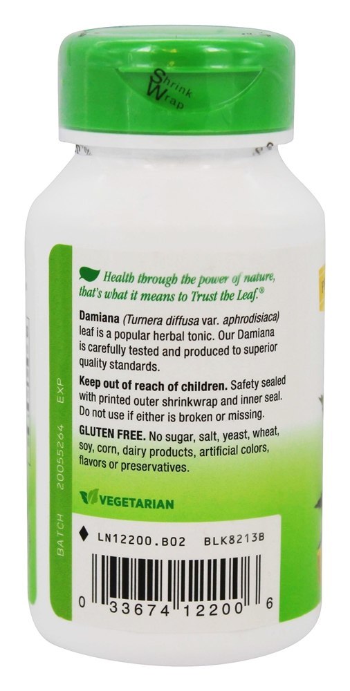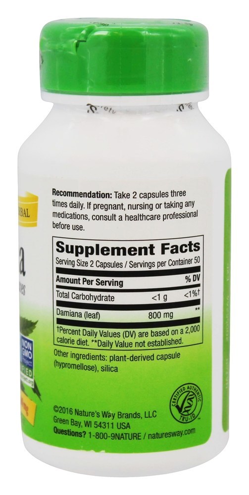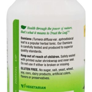 Nature’s Way Damiana Folhas é TRU-ID e não transgênico certificado. Damiana (Turnera diffusa var. aphrodisiaca) folha é um popular de ervas tônico. Nature’s Way damiana é cuidadosamente provado e produzido para superior qualidade padrões. Saúde através do poder da natureza. Isso é o que significa “Confiar na Folha”.