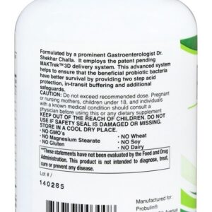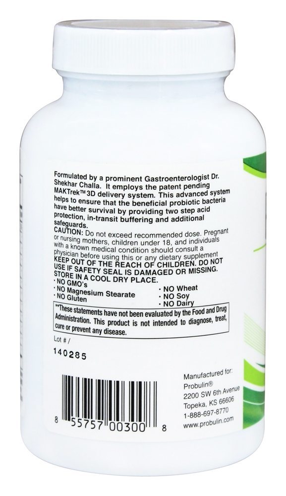 Probulin Probulin 6 Bilhões de UFC são probióticos e prebióticos diários que apoiam a saúde digestiva e o equilíbrio digestivo. Esta Probulin contém 6 mil milhões de CFU por dose ( 3 cápsulas). Probulin emprega o sistema de entrega MAKTrek 3D com patente pendente. Esse sistema avançado ajuda a garantir que as bactérias probióticas benéficas tenham melhor sobrevida, fornecendo proteção contra ácido de duas etapas, tamponamento em trânsito e salvaguardas adicionais. Probulin cores, sabores e conservantes artificiais.