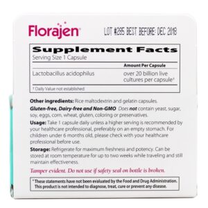 Florajen contém exatamente a mesma cepa de Lactobacillus acidophilus usada desde 1973 pela maioria das empresas de iogurte nos Estados Unidos, mas é livre de produtos lácteos.