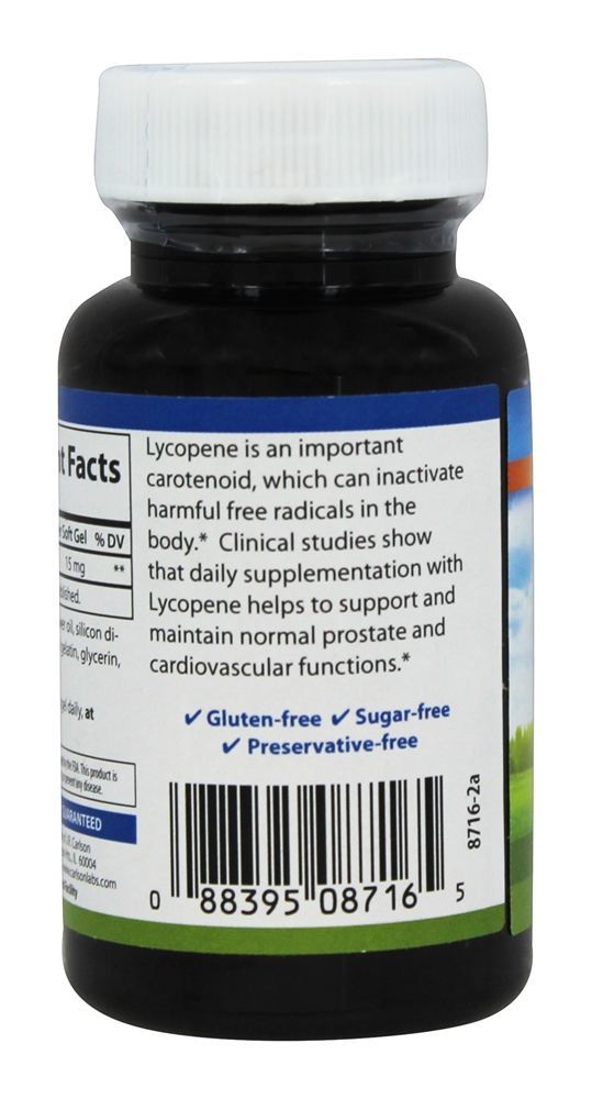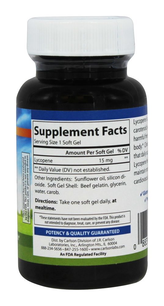 Carlson Labs licopeno é sem tomate. Carlson Labs licopeno é um importante carotenóide. Carlson Labs licopeno pode inativar os radicais livres no organismo. Estudos clínicos mostram que a suplementação diária com o Carlson Labs licopeno ajuda a manter a saúde normal da próstata. Carlson Labs licopeno existe naturalmente em alimentos como tomate, toranja rosa, goiaba e melancia. Estudos populacionais sugerem dietas ricas em Carlson Labs licopeno pode reduzir o risco de vários tipos de câncer, especialmente do pulmão, estômago, próstata e mama. Sua atividade antioxidante também pode oferecer benefícios para várias outras condições.