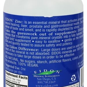 Eidon Iônico Minerais Zinco Líquido ativa saudável imune função, gastrointestinal saúde, ferida cura, e sentido de gosto e cheiro. Zinco apóia normal crescimento durante gravidez, infância e adolescência. É excretado rapidamente durante o estresse. A deficiência de zinco é generalizada. Eidon Ionic Minerals O líquido de zinco é fácil de engolir e suavizar o estômago. Não contém açúcares, amido, glúten, conservantes, corantes ou aromatizantes artificiais. Eidon Líquido Zinco tem nunca sido provado em animais, contém não animal por-produtos e é adequado para vegan dietas. Pureza que você pode ver, saborear e sentir.
