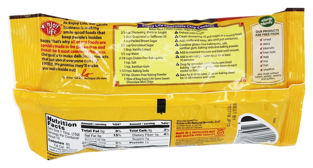 Mas perder as coisas ruins não significa que elas perderão o sabor ou textura que você deseja! Enjoy Life é criativo com seus ingredientes para lhe trazer alimentos seguros e deliciosos. Além de garantir produtos de arroz, eles usam alternativas de grãos ricos em nutrientes e sabor, como quinoa, amaranto, trigo sarraceno e farinha de sorgo. Em vez de ovos, eles usam uma combinação de fermento em pó, linho e molho de maçã. Em vez de gorduras saturadas, elas usam óleo de cártamo não hidrogenado e isento de gordura trans. Para adoçantes, Desfrutar Vida salta o refinado material e usa um combinação de natural fruto sucos e mel ou puro marrom cana açúcar. Eles também assar com extrato de alecrim e uma mistura de suco de frutas / dextrina de grãos para manter a frescura e prolongar a vida útil.