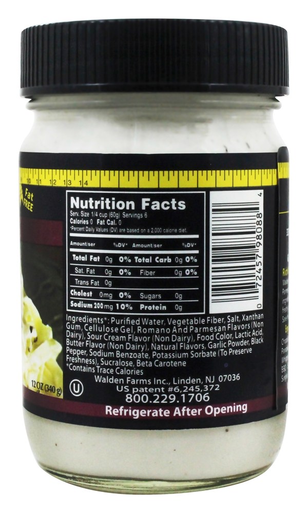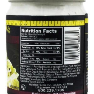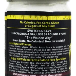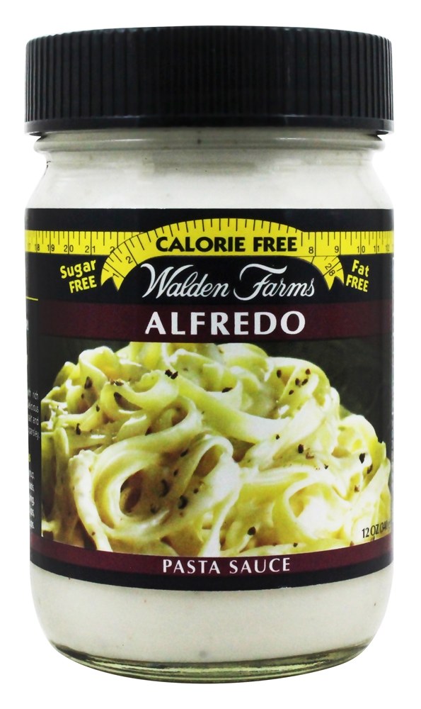 Walden Farms Caloria Livre Alfredo Macarrão Molho contém não calorias, gordura, carb, glúten ou açúcares de qualquer tipo! Walden Farms Alfredo Molho tem um novo olhar mas o mesmo grande gosto feito com natural Parmesão & Romano Queijo e azedo creme sabores, zesty rachado preto pimenta, em cubos cebolas e recentemente terreno ervas & temperos.