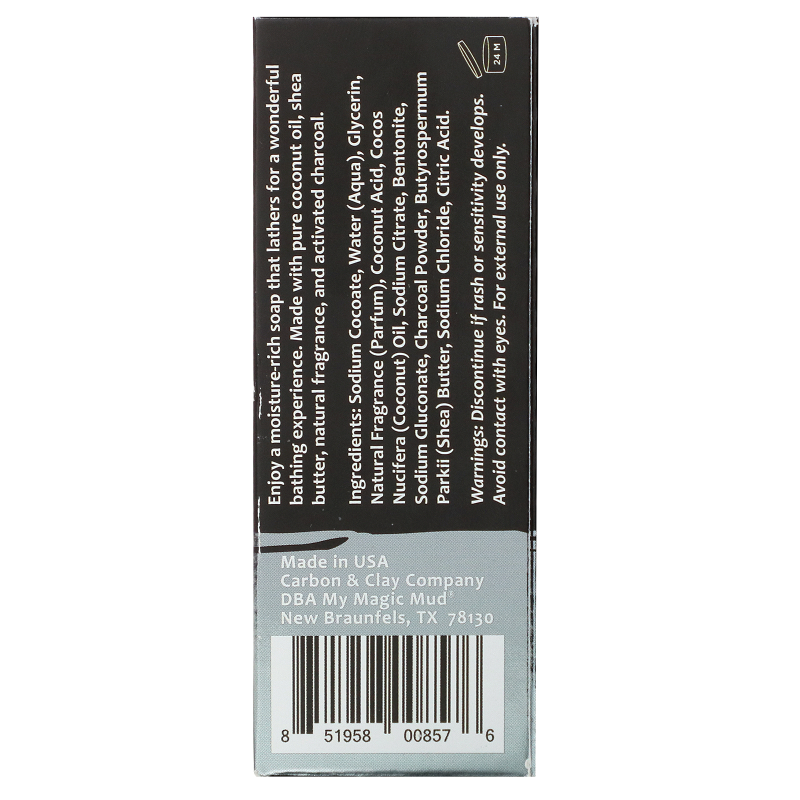 Enjoy a moisture-rich soap that lathers for a wonderful bathing experience. Made with pure coconut oil, shea butter, natural fragrance, and activated charcoal.