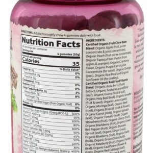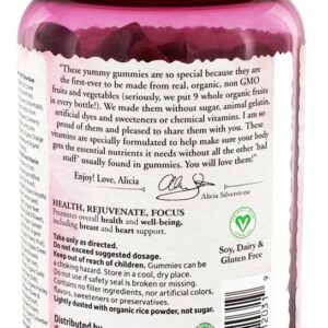 Fabricadas apenas com ingredientes alimentares integrais, as Gummies Múltiplas para Mulheres da mykind Organics têm como alvo ingredientes para atender às necessidades especiais das mulheres com cranberry de alimentos orgânicos orgânicos Pacran e 800IU Vegan D3.