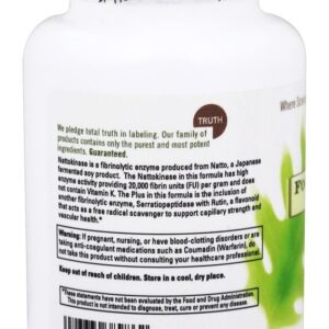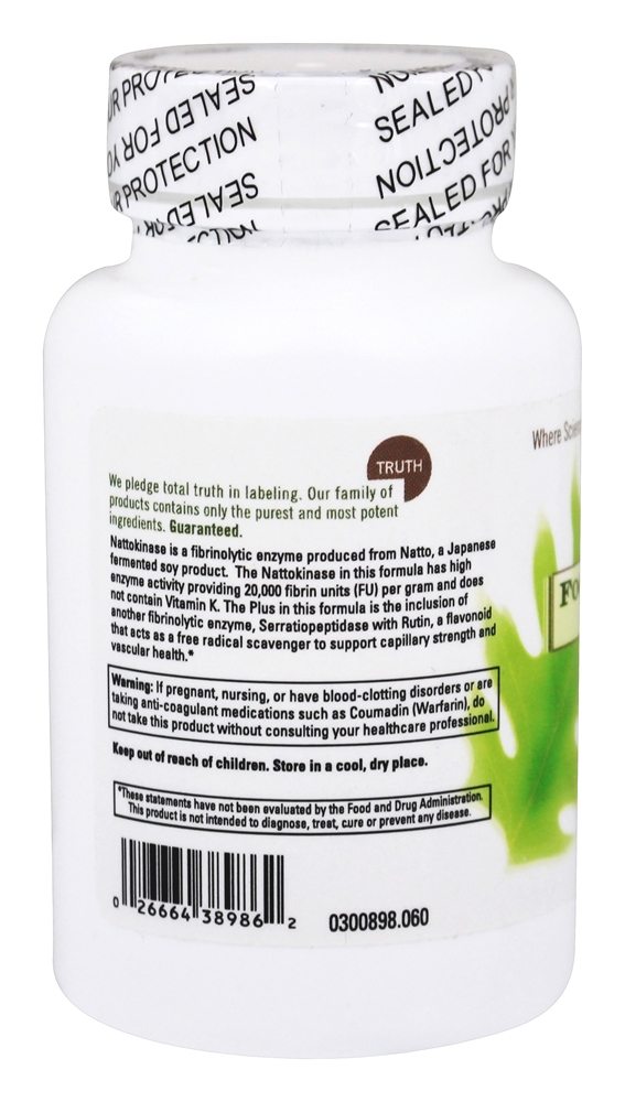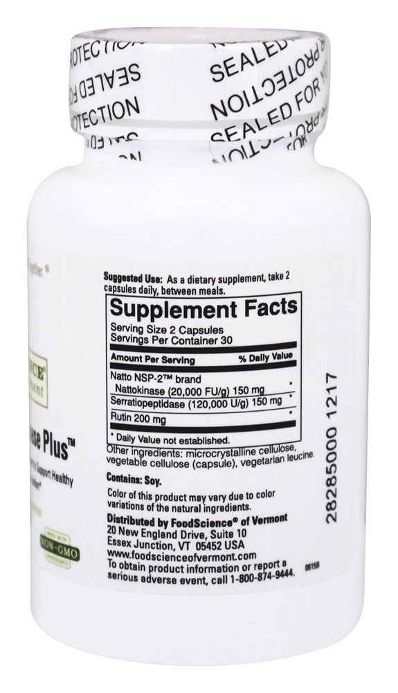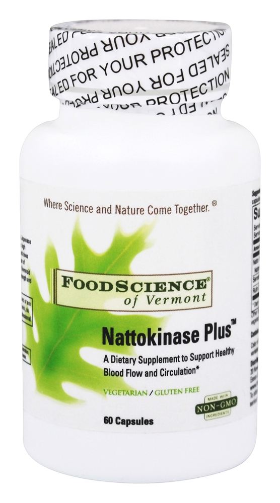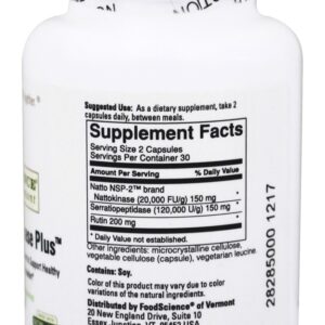 FoodScience of Vermont Nattokinase Mais cápsulas fornecer um dietético completar para apoiar saudável sangue fluxo e circulação. A nattakinase é uma enzima fibrinolítica produzida a partir de um alimento de soja fermentado japonês da Natto. A Nattokinase nesta fórmula tem alta atividade enzimática, fornecendo 20,000 unidades de fibrina (FU) por grama e é livre de vitamina K. O Plus nesta fórmula é a inclusão de outra enzima fibrinolítica, Serratiopeptidase com Rutina, um flavonóide. que atua como um antioxidante e limpador de radicais livres para apoiar a força capilar e saúde vascular.