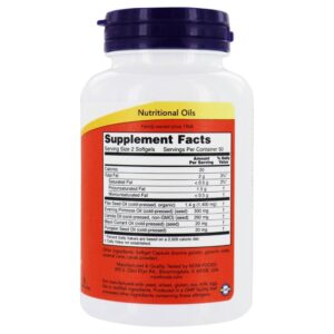 NOW Foods Omega 3 – 6 – 9 fornece uma mistura equilibrada de dois ácidos graxos polinsaturados essenciais ácidos (e seus derivados) necessários para muitas funções do corpo: Óleo Omega-3 da semente de linho e da canola e Óleo Omega-6 (GLA) da prímula e da groselha preta. O ácido oleico, um Omega-9 da canola e da semente de linho, é uma gordura monoinsaturada não considerada “essencial”, mas desempenha um papel benéfico na saúde humana. Do site da FDA: “O consumo de ácidos graxos ômega-3 pode reduzir o risco de doença coronariana. A FDA avaliou os dados e determinou que, embora existam evidências científicas que apóiem a alegação, a evidência não é conclusiva (ver informação nutricional para conteúdo de gordura) “.