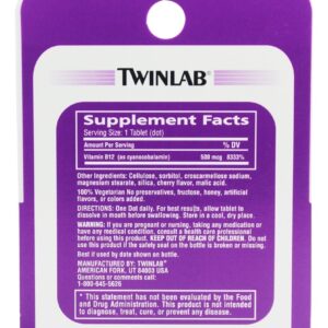 Twinlab Os pontos B-12 contêm 500 mcg de cianocobalamina. A vitamina B-12 (cianocobalamina), um membro da família do complexo B, ajuda a manter as células nervosas e glóbulos vermelhos saudáveis, é necessária para produzir DNA e desempenha um papel importante na produção de energia natural. Twinlab B-12 Os pontos são micro-comprimidos especialmente formulados que se dissolvem rapidamente na boca antes de serem engolidos. Cada delicioso ponto natural com sabor de cereja fornece 500 mcg de vitamina B-12.