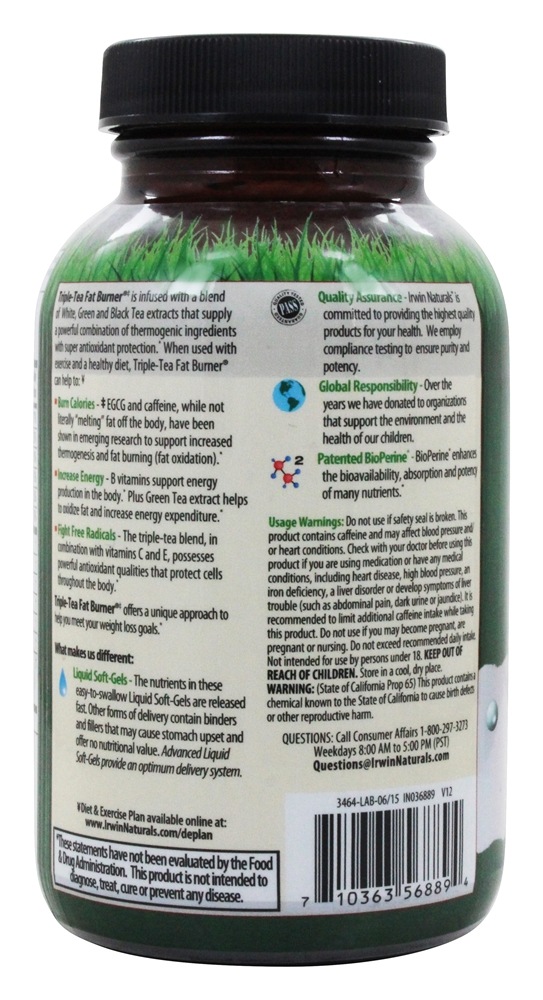 Irwin Naturals Triplo-Chá Gordura Queimador é infundido com um misturar de Branco, Verde e Preto chá extratos que fornecer um poderoso combinação de termogênico ingredientes com super antioxidante proteção. Quando usado com exercer e um saudável dieta, Irwin Naturals Triplo-Chá Gordura Queimador lata ajudar para: