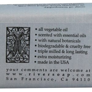 River Soap Company sabonetes triturados franceses de , grandes e de longa duração 4.5 são todos vegetais, biodegradáveis e sem crueldade. Seus sabonetes não contêm perfumes nem corantes artificiais. As cores sutis são derivadas de especiarias naturais e botânicos. Eles usam óleo essencial puro para perfumar seus sabonetes naturais e adicionar óleo de amêndoa doce a cada barra de sabão para torná-los hidratantes extra.