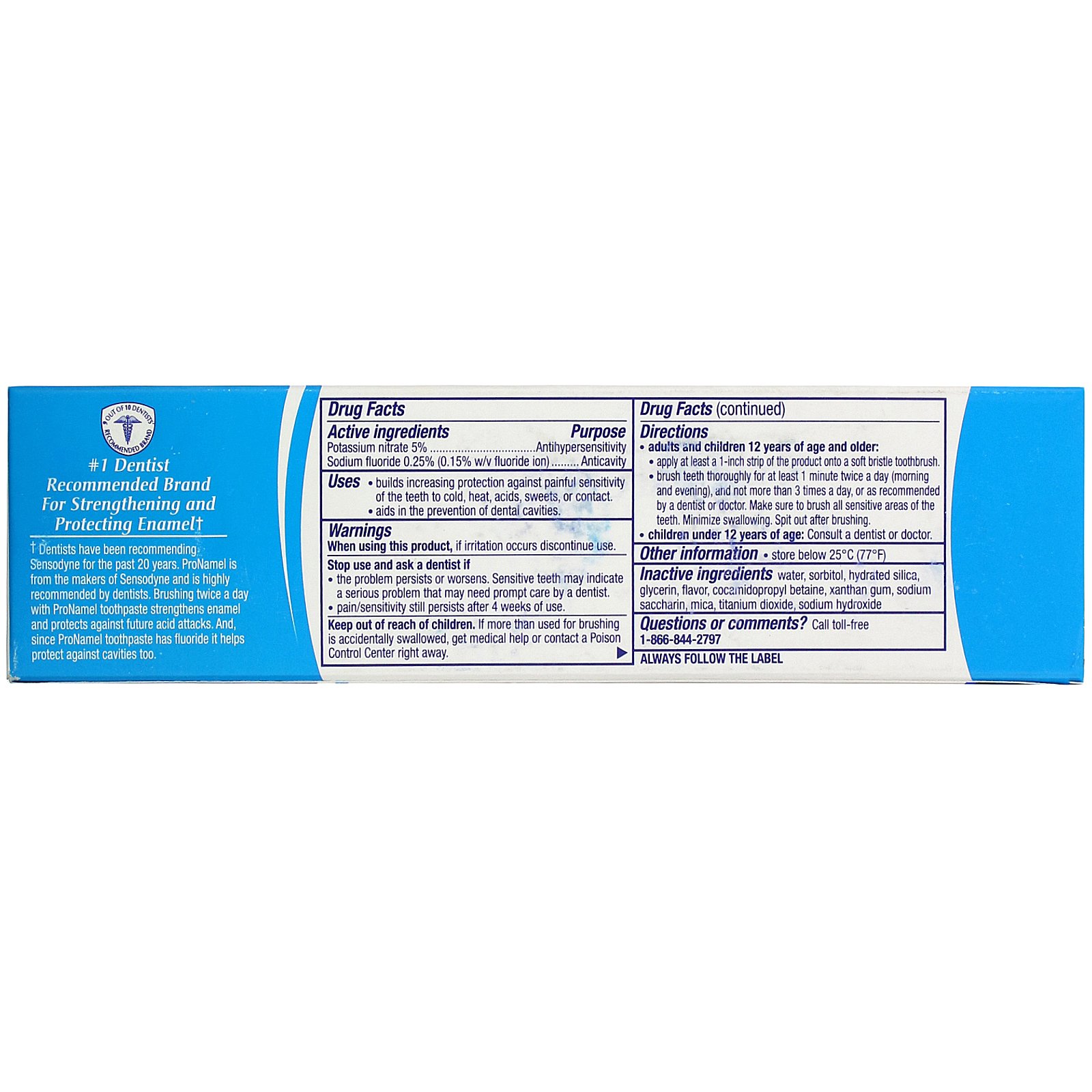 †Dentists have been recommending Sensodyne for the past 20 years. ProNamel is from the makers of Sensodyne and is highly recommended by dentists Brushing twice a day with ProNamel toothpaste strengthens enamel and protects against future acid attacks. And, since ProNamel toothpaste has fluoride it helps protect against cavities too.
