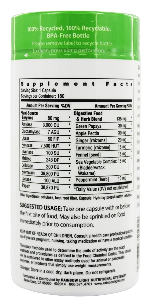 Avançado Enzima Sistema facilita digestão e assimilação particularmente para pessoas com digestivo dificuldades e mais velho indivíduos de quem digestão é fraco por entrega enzimas e promover enzima atividade. Enzimas de fonte vegetal de alta potência de amplo espectro para o máximo suporte digestivo. O ensaio métodos usado para determinar o unidades para determinar o unidades de atividade são o exato métodos e procedimentos como definido em o Comida Químico Códice. Eles não devem ser comparados a outros métodos de ensaio usados para animais, papaína, bromelaína, enzimas pancreáticas ou produtos que simplesmente usam medidas de peso. Rainbow Light Sistema Avançado de Enzimas do foi desenvolvido para fornecer a suplementação de enzimas vegetariana mais abrangente disponível. A suplementação enzimática é importante, pois a enzima é destruída ou depletada quando o alimento é cozido, processado de refinado. Sistema avançado de enzimas oferece: Enzimas alimentares de espectro total para todos os componentes da dieta: proteínas, carboidratos, gorduras, açúcares e fibra alimentar. Escove enzimas de borda, como maltase, invertase e lactase, para quebrar ainda mais os carboidratos em seus constituintes mais básicos. Alimentos abrangentes e base de ervas com mamão verde, maçã pectina, gengibre, açafrão e hortelã-pimenta para apoio digestivo adicional. Benefício máximo quando tomado com ou antes das refeições.
