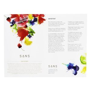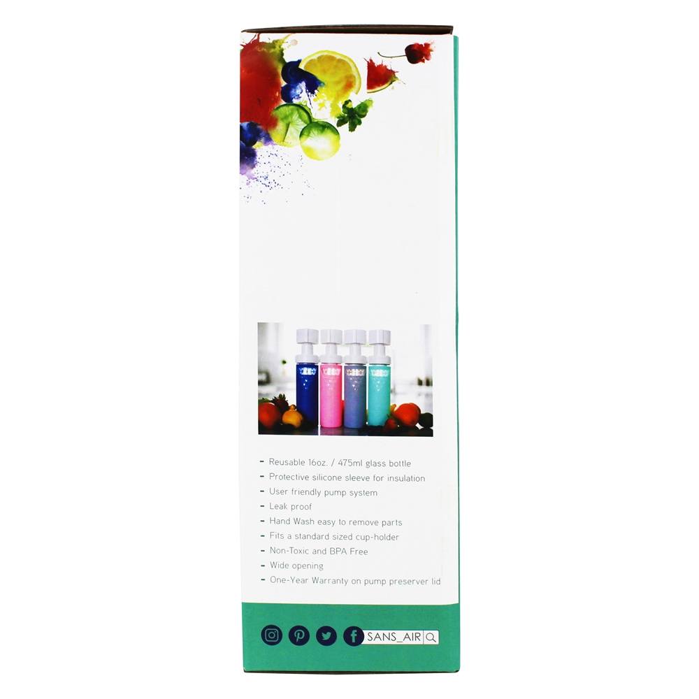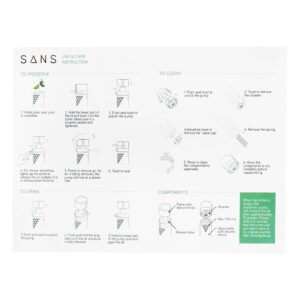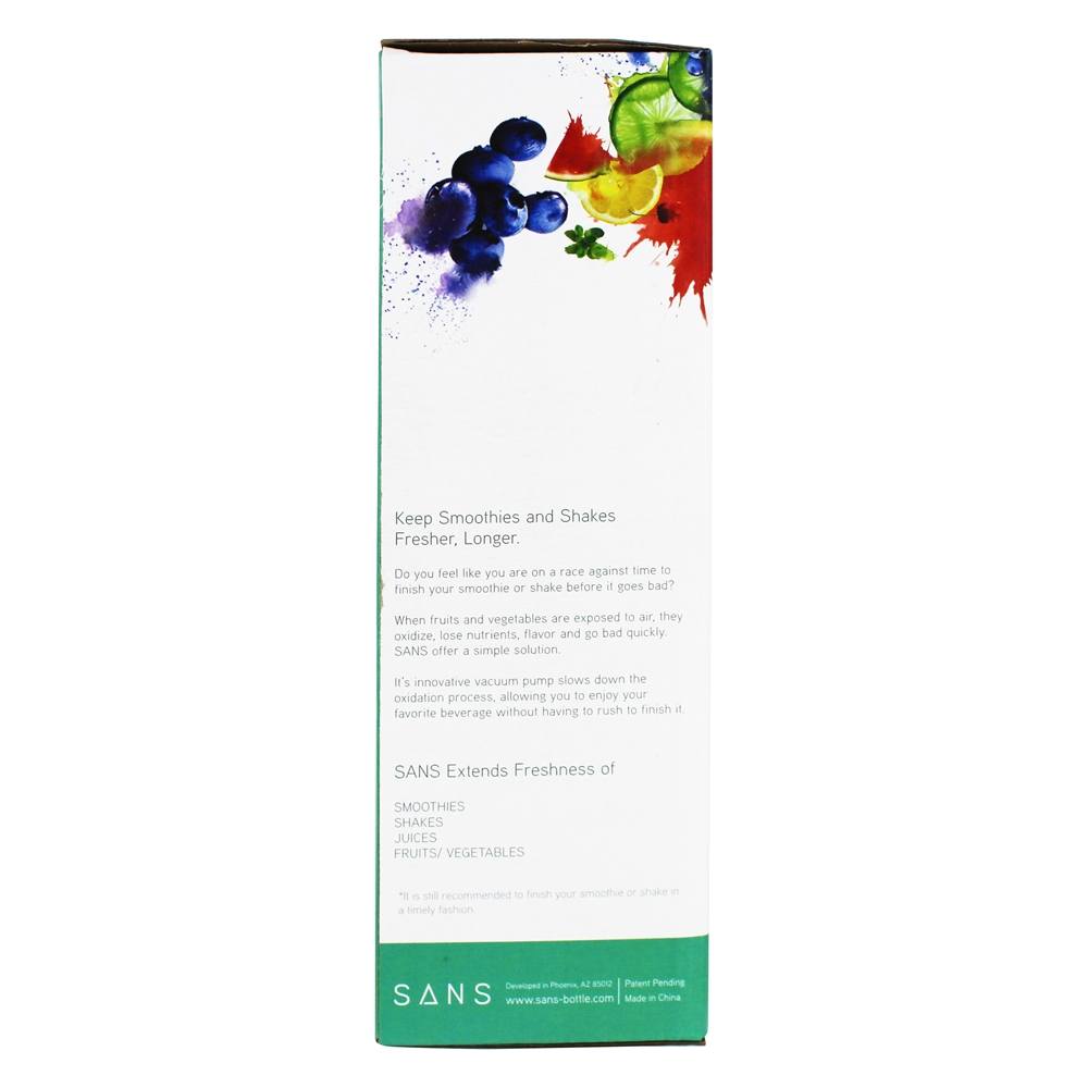 Frutas e vegetais são propensos à oxidação quando expostos ao ar e tendem a perder nutrientes, sabor e ficam ruins rapidamente. Para resolver esse problema, o frasco SANS foi criado. Seu inovador mecanismo de bomba de vácuo ajuda a preservar o conteúdo da garrafa, removendo o ar e criando um vácuo dentro da garrafa. Isso retarda o processo de oxidação, permitindo que você aproveite sua bebida favorita no seu tempo, sem ter que correr para terminá-la antes que ela acabe.