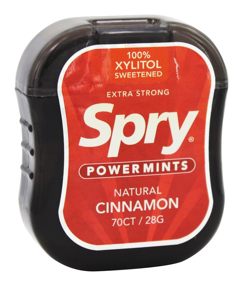Goma Spry é adoçado apenas com xilitol. Freqüentemente comer alimentos ricos em açúcares e amidos pode promover a cárie dentária. O xilitol, ao contrário de outros açúcares, pode reduzir o risco de cárie dentária.