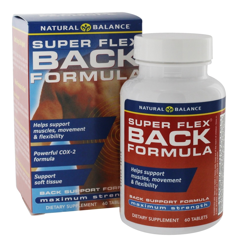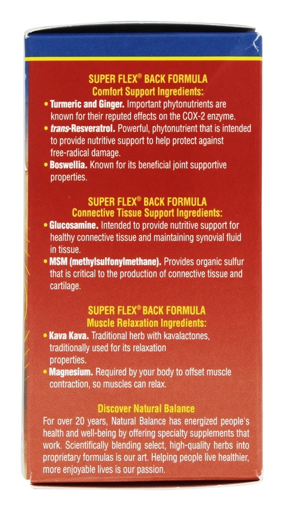 Natural Balance Super Flexionar Máximo Força De volta Fórmula ajuda apoiar músculos, movimento e flexibilidade. Desfrutar vida para o máximo com Natural Balance Super Flexionar De volta Fórmula, o exclusivo triplo alvo de volta produto. Esta fórmula contém ingredientes especiais destinados a fornecer suporte nutritivo para um tecido conjuntivo saudável, relaxamento muscular e conforto geral. Esta mistura especial de ingredientes também ajuda a inibir a enzima COX-2, para que você possa voltar a fazer o que você ama!