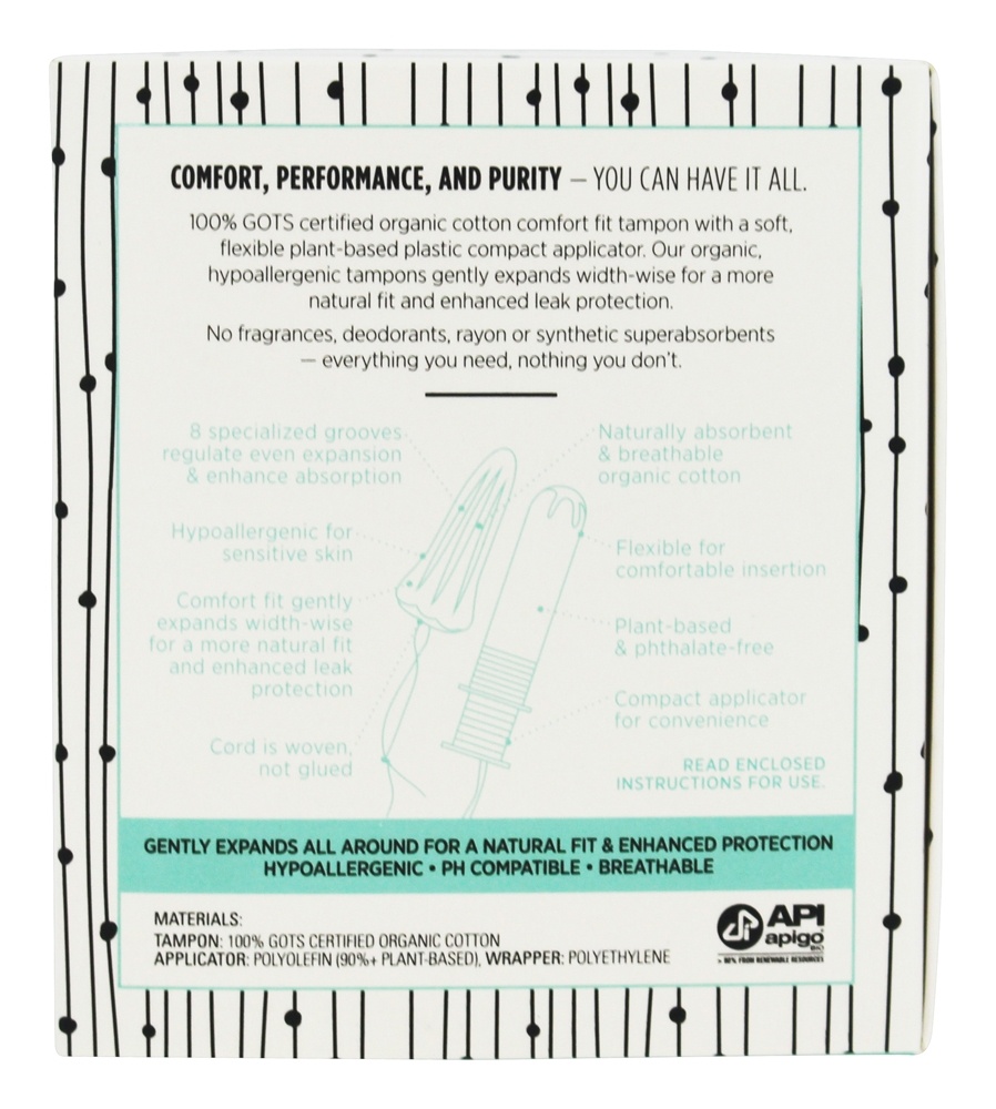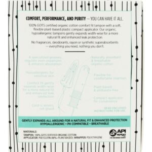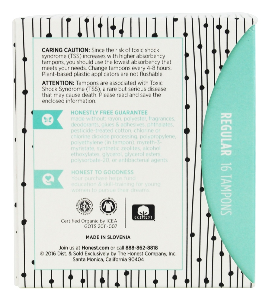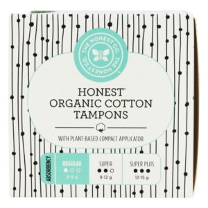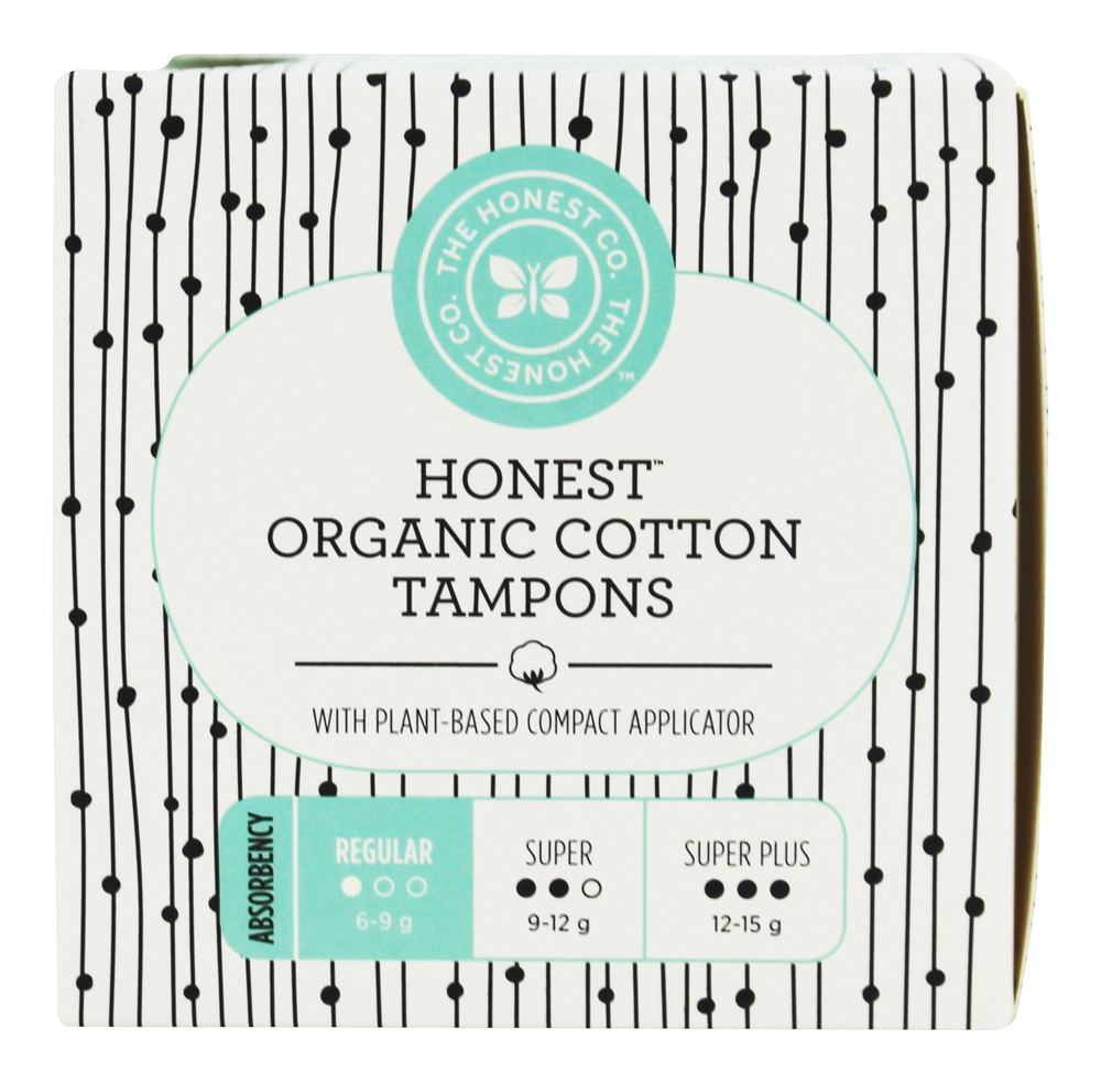 The Honest Company Tampões de Algodão Orgânico O produto é feito com algodão orgânico certificado com 100 % GOTS. Este tampão de algodão orgânico adapta-se confortavelmente a um aplicador compacto de plástico macio e flexível à base de plantas. The Honest Company absorventes hipoalergênicos expandem-se suavemente em todas as direções para trabalhar naturalmente com seu corpo, melhor ajuste e proteção.
