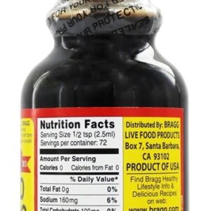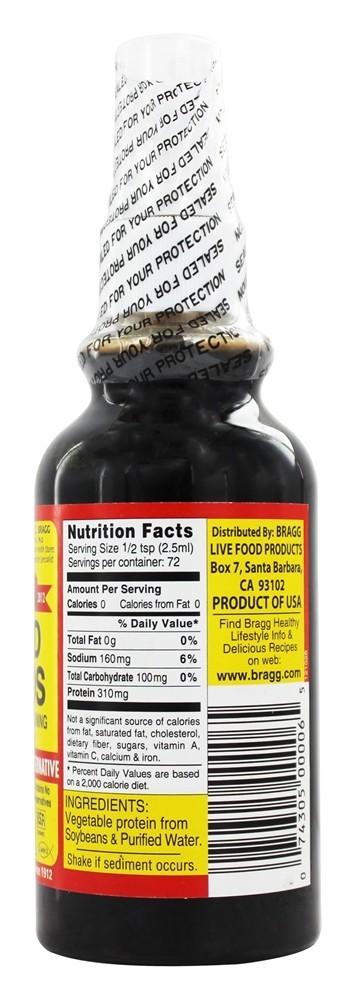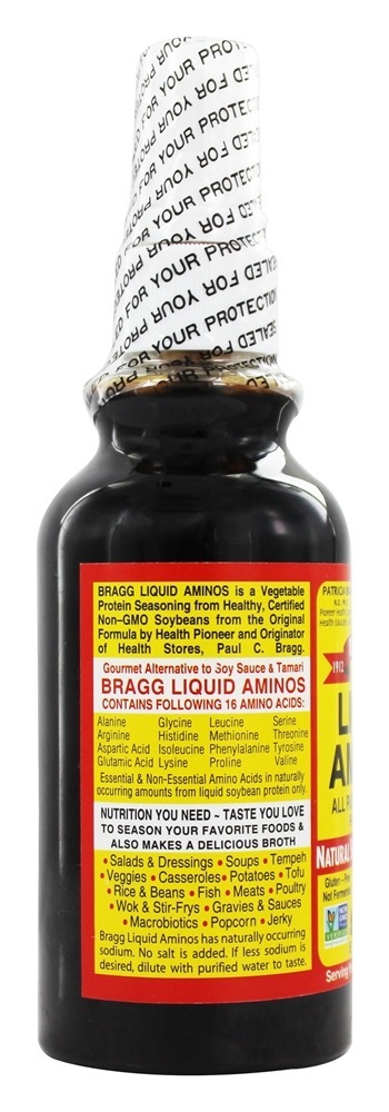 Bragg Líquido Aminos é um saboroso líquido proteína contendo essencial e não essencial amino ácidos, derivada de saudável soja e pode ser usado em ou em um variedade de alimentos. Bragg Aminos Líquido traz novas delícias para: saladas, molhos, sopas, legumes, arroz, feijão, tofu, wok & stir frys, caçarolas, batatas, carnes, aves, peixe, carne seca, pipoca, molhos, macrobióticos e muito mais! Bragg Aminos líquido tem uma pequena quantidade de sódio natural. Nenhum sal de mesa é adicionado. Se menos sódio for desejado, use uma 6 oz. Bragg frasco de spray e diluir com 1 / 3 água destilada ou a gosto e adicionar ou pulverizar os alimentos.