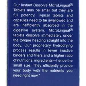 Superior Source Os comprimidos de MicroLingual de dissolução instantânea podem ser pequenos, mas têm potência total! Os comprimidos e cápsulas típicos precisam ser engolidos e ineficientemente absorvidos no sistema digestivo. Comprimidos MicroLingual dissolver imediatamente sob a língua indo direto para o corpo. Seu processo de hidrodera- ção proprietário resulta em menos ligantes e preenchedores inativos e uma maior proporção de ingredientes nutricionais – daí o tamanho pequeno. Eles fornecem eficientemente seu corpo com os nutrientes que você precisa agora.